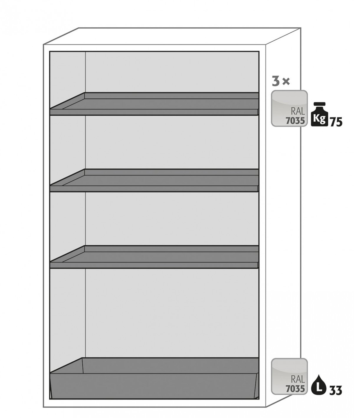 Model S90.196.120 je vybaven třemi policemi a jednou záchytnou vanou, dodáván ve světle šedé barvě.