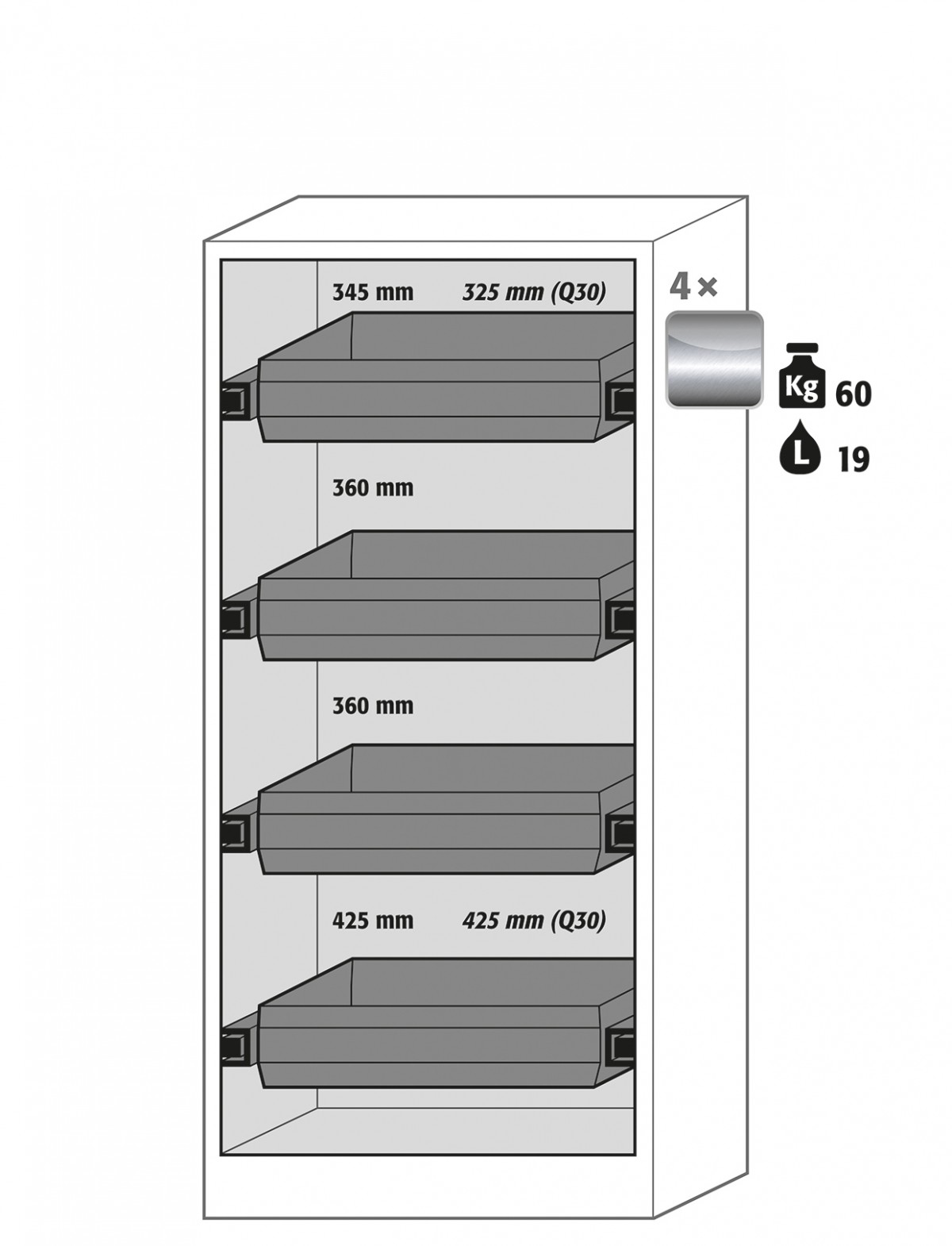 Model Q30.195.086.WD je vybaven čtyřmi výjezdnými policemi, dodáván se světle šedými dveřmi.